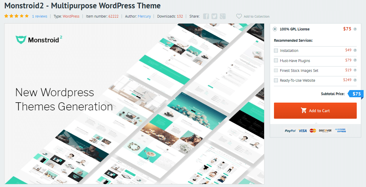 So in order to start building your websites on Monstroid 2, you will have to pay only once. The price for this theme is $75, so once you received your order - feel free to developing as many websites as you want.