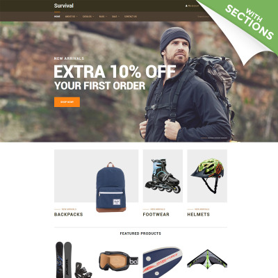 The template was custom-made for adventure, airsoft, biking, climbing, diving, fishing, motorcycling, sports clothing, equipment store, travel wear, travel gear, extreme sports shop, sports, outdoors and travel, fashion and beauty, business and services, electronics, cars and motorcycles sites.