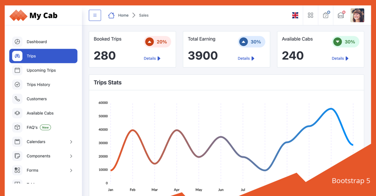 My Cab 是使用最新的Bootstrap 5构建的与出租车相关的管理模板。这是一个干净而独特的设计理念。这些图表是使用 CSS 定制的。配色方案选自 Adobe 配色方案。所有 HTML 页面都有很好的注释并包含文档。默认情况下,My Cab管理仪表板附带分析和统计仪表板选项。您可以通过选择起始页 HTML 来启动您的项目。一些特殊页面包括出租车行程、行程历史记录、可用出租车、行程、日历、数据表、Apex 图表、发票、客户和用户个人资料。所有可重用组件均已创建。
