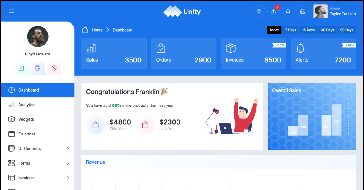 Unity –管理主题是一个时尚且专业的主题,专为管理面板和后端界面设计。它采用简洁、现代的设计,增强了用户体验,并使管理区域的导航变得轻而易举。它附带了一系列UI 组件和小部件,可以轻松集成到您的管理页面中。该管理仪表板还包括响应式设计,可确保在各种设备(包括台式机、平板电脑和手机)上实现最佳可用性。凭借其直观的界面和高级功能,它简化了后端应用程序的管理和组织,使您能够有效地管理用户、内容和设置。通过此管理仪表板,管理员可以轻松查看和分析数据、管理用户帐户、跟踪指标、配置系统设置以及执行各种管理任务。