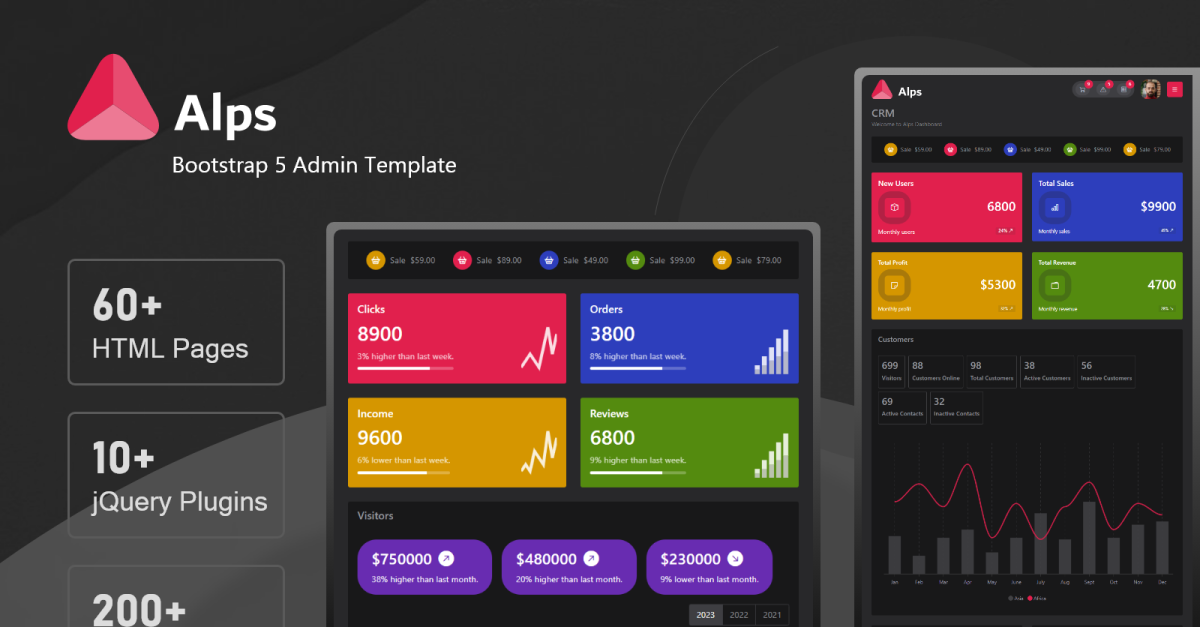 Alps Bootstrap 管理模板采用现代暗模式设计和庞大的组件库,可轻松为您的 Web 应用或 SAAS 创建精致的仪表板,开箱即用,效果极佳。灵活的 Bootstrap 框架和 Sass 文件允许您轻松自定义模板以匹配您的品牌。无论您是希望快速启动管理面板的开发人员,还是需要坚实起点的设计师,此管理仪表板模板都具备您更快启动所需的一切。