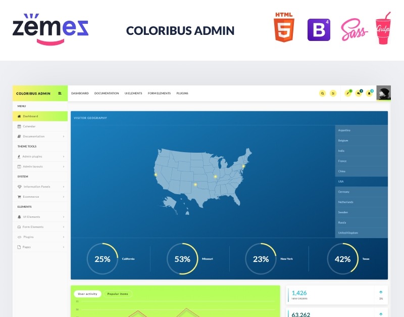 该仪表板管理面板包含您关注网站所需的所有内容。它包括许多图形和块,代表您网站上的流量、自定义选项、客户等等。例如,使用 Coloribus Admin,可以轻松检查您的客户来自哪里以及他们在寻找什么。此外,此管理模板允许您使用其他插件和布局编辑您的网站。您还可以使用内置的电子商务功能和 UI 元素。这意味着 Coloribus 适合各种类型的网站,甚至在线商店。同时,简洁的设计使 Coloribus 易于导航。完整的文档包含许多有用的信息。