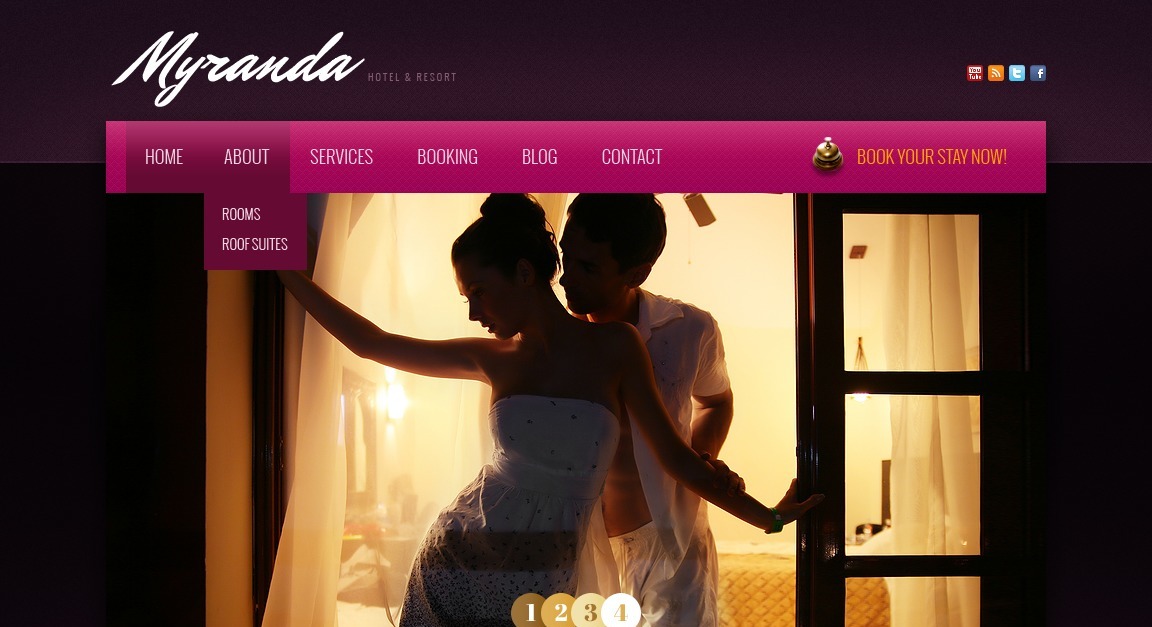 紫色和粉色的组合赋予设计精致和优雅。手写字体和其他较小的元素强化了这一特征。这样,游客第一眼就能知道你的酒店的档次。然后他们可以在紧凑的内容区域中查看更详细的信息。毕竟,他们可以借助社交媒体按钮轻松分享印象。