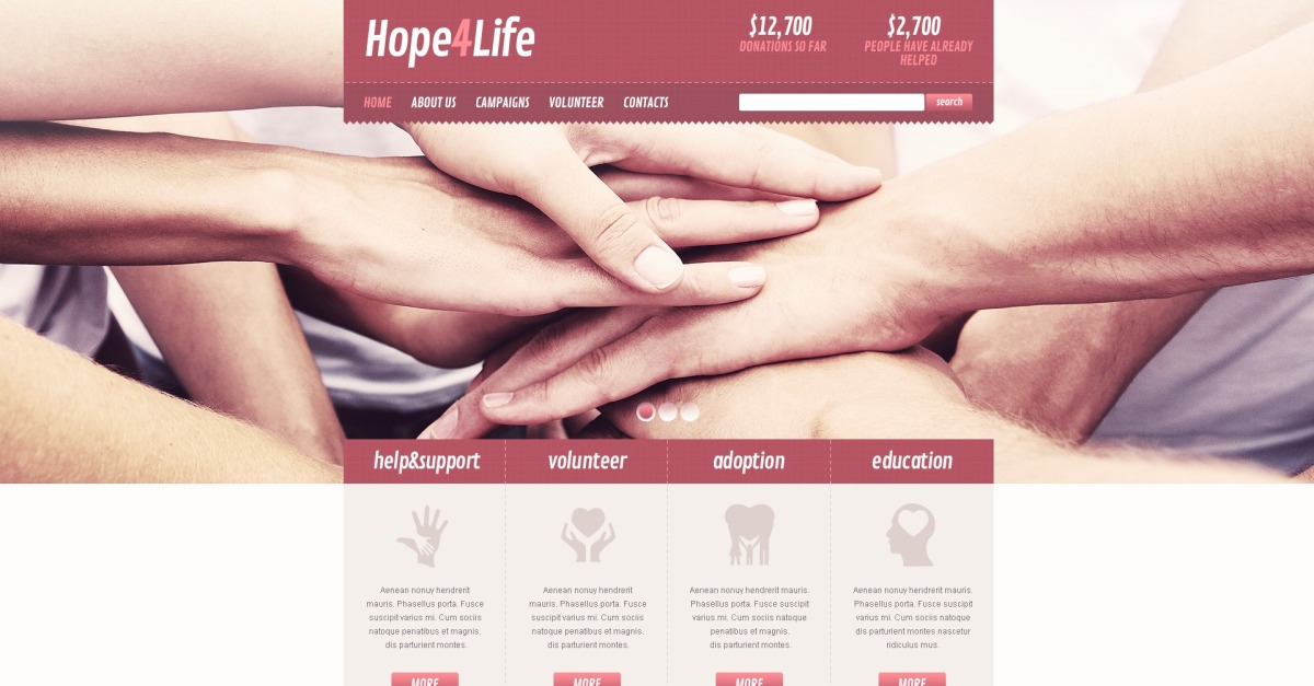 这个主题的主色调是红色——一种心的颜色,象征着善良和同理心。心形图标和标志改善了象征意义。但无论如何,您的慈善理念甚至在访客观看插图和阅读文字之前就会被宣扬。