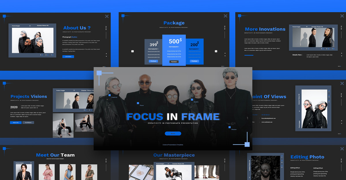 FOCUS IN FRAME Photography Google Slides Template 是一个摄影机构演示文稿模板,采用扁平化设计,干净、简约、现代的演示文稿,适合创意行业,如时尚、网站代理、摄影行业、模特等行业。