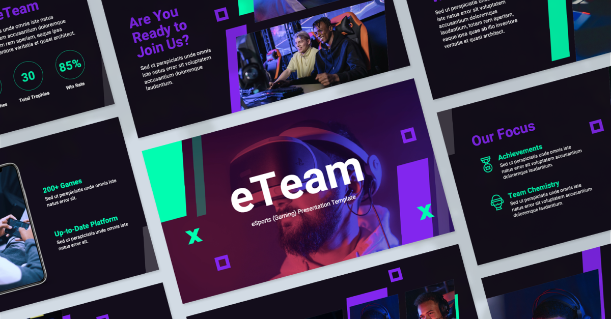 在创建 eTeam 演示模板时,我们的主要关注点是从事电子竞技、游戏行业、游戏工作室和游戏创作者的公司和个人。无论您是要向重要的新客户还是业务组合进行投标,此 Google 幻灯片模板都可以让您快速高效地将信息和数据转化为演示文稿。