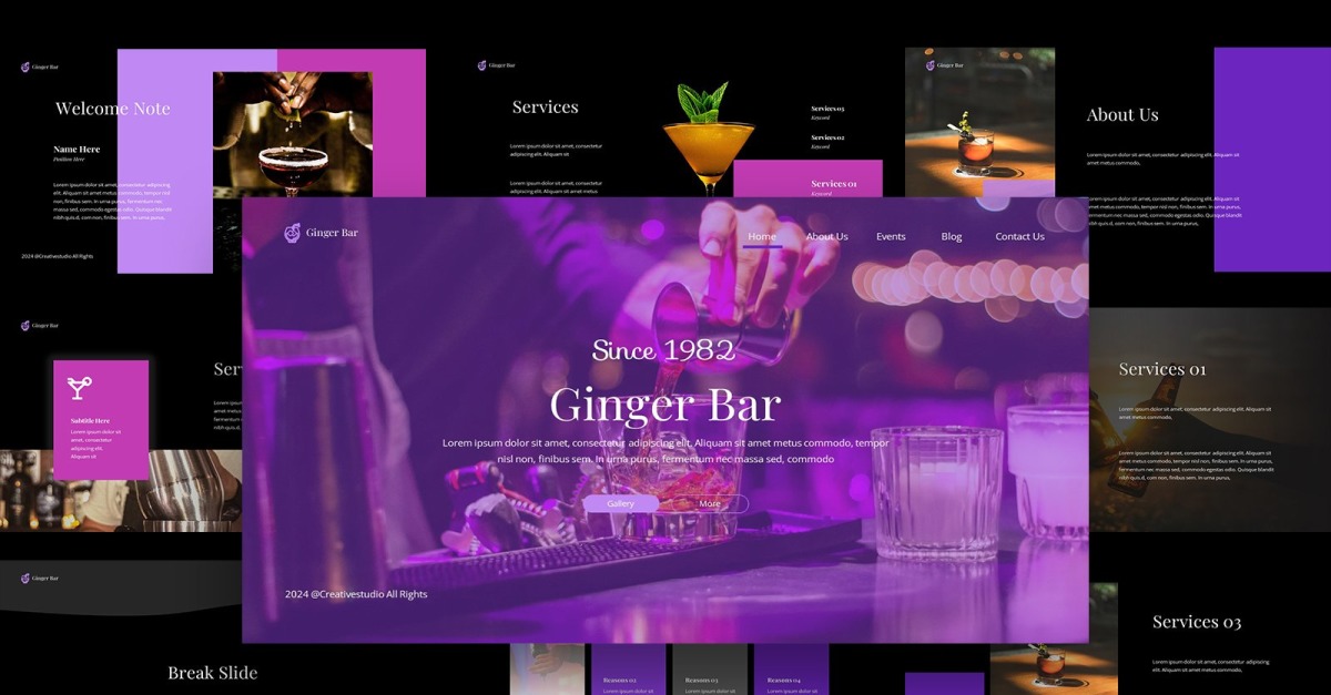 Ginger Bar Google Slides 模板适用于酒吧和休息室演示模板。采用色彩鲜艳、充满活力的设计,让您的演示脱颖而出,成为高品质的品牌演示资产。