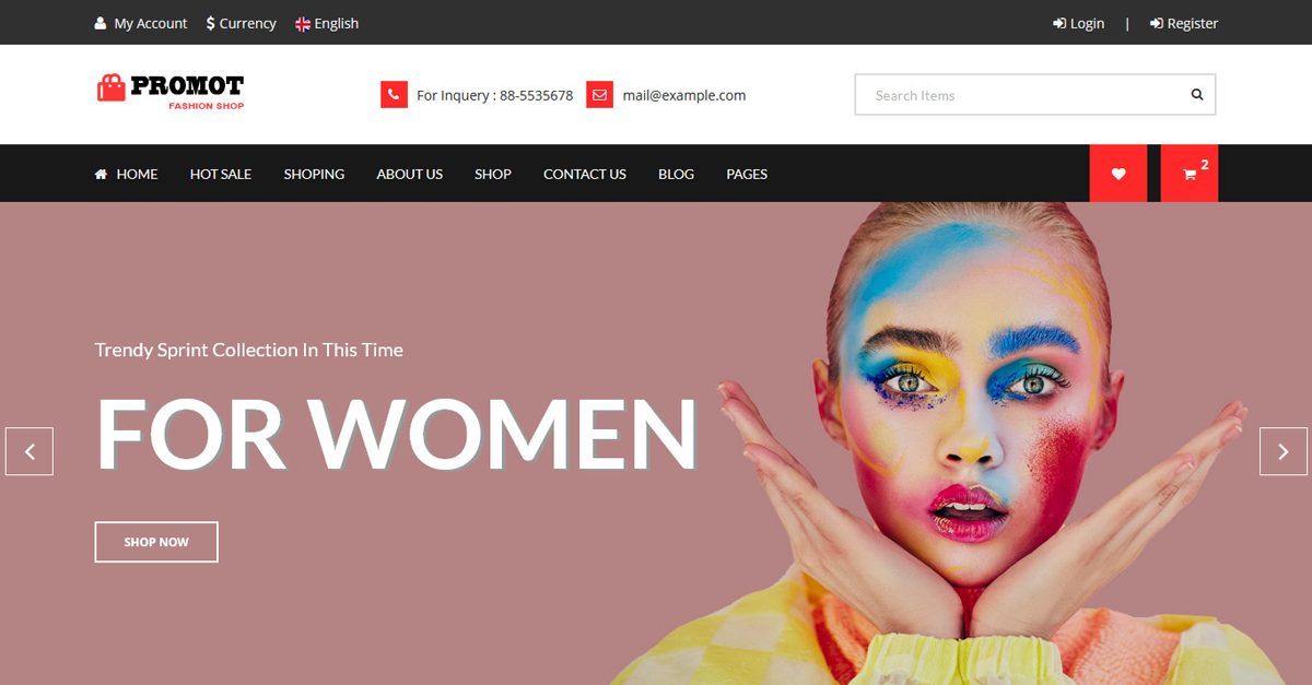 Promot 时装店 Bootstrap 模板是一个现代且干净的 Bootstrap HTML 模板,专为时尚、创意、在线商店、女装、配饰、数码、儿童、手表、珠宝、鞋子、儿童、家具、运动或多用途而设计。使用干净的引导 HTML 模板编辑此模板非常简单!您可以在几分钟内更改颜色、文本或替换图像。促销时装店 Bootstrap 模板完整响应模板适用于桌面、平板电脑、移动设备和更多布局。