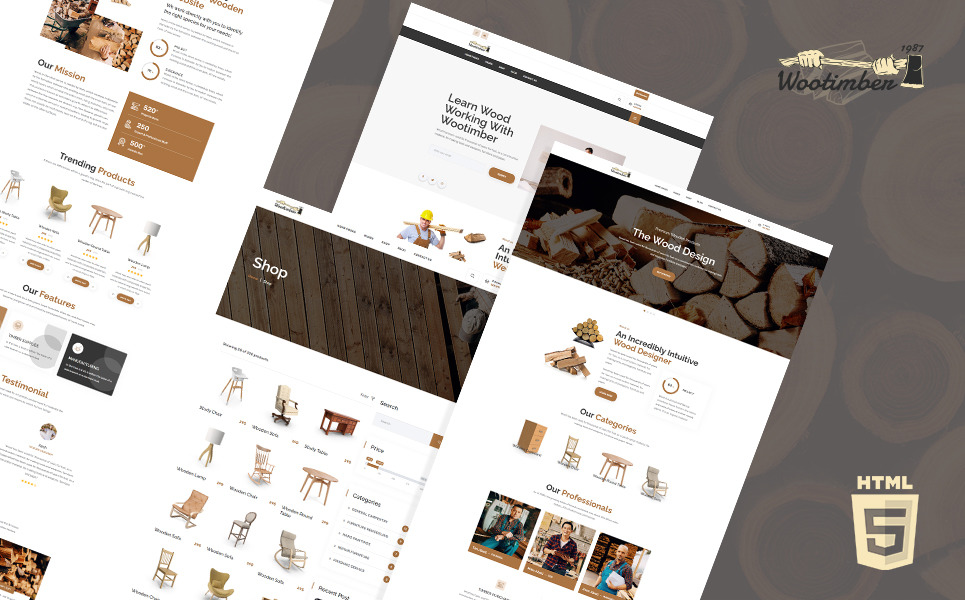 Wootimber Carpenter Wood 商店 HTML5 网站模板包括一个商店,其中包含所有相关页面,例如登录页面 - 注册 - 愿望清单等。