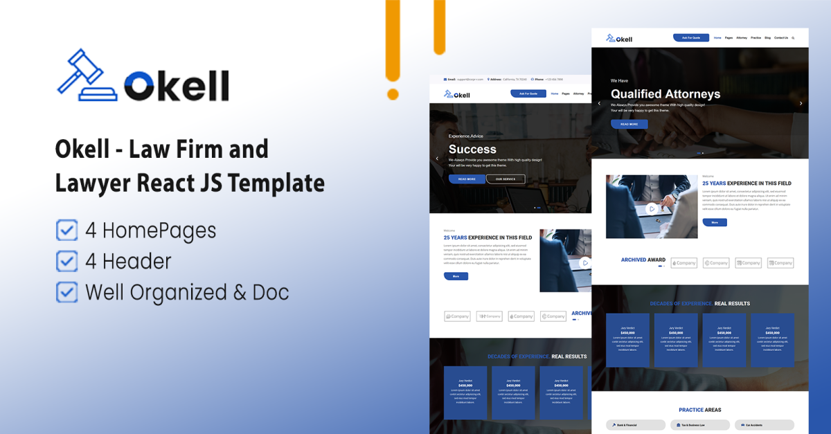 总而言之,如果您正在寻找一个既具有视觉效果又易于使用的网站模板,那么Okell - Law Firm and Lawyer React JS 模板是一个绝佳的选择。其现代化的设计、可定制的布局以及与 React JS 的集成使其成为任何寻求建立强大在线影响力的律师事务所的顶级竞争者。