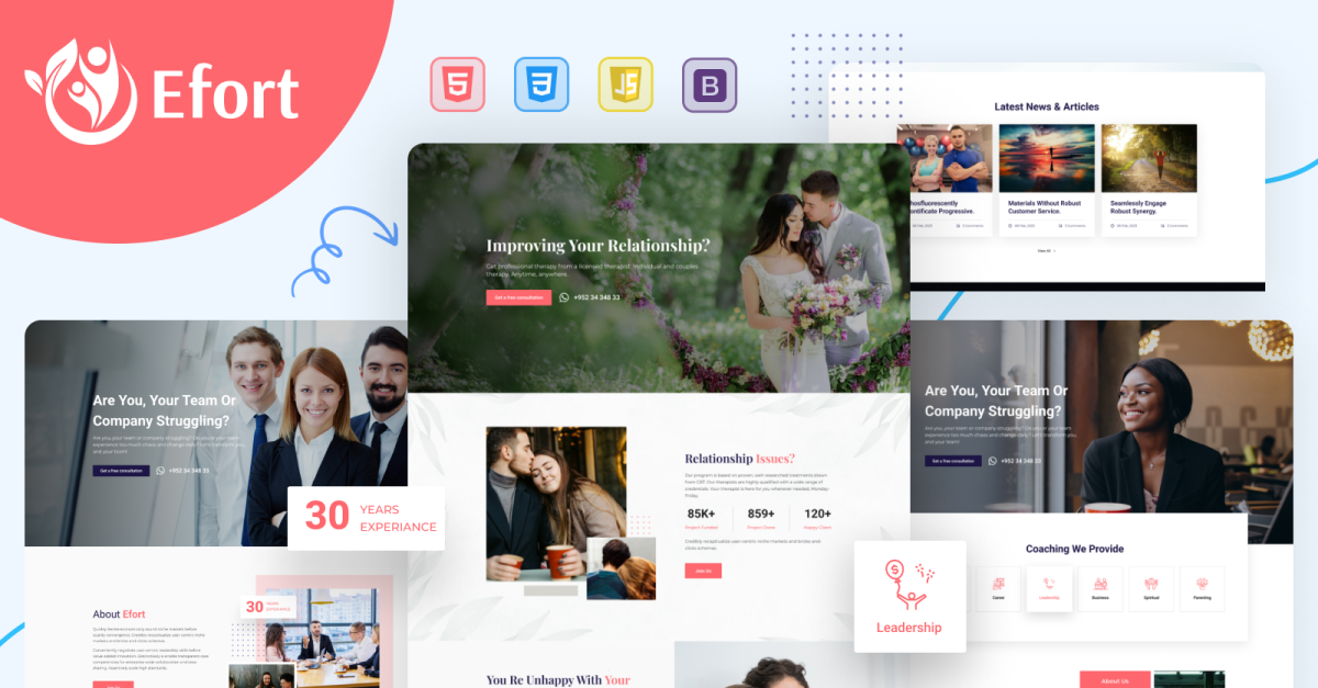 您可以在家在线开展生活教练业务,这样您就可以随时随地工作!在家工作,做一些副业,最终,你可以从生活教练业务中获得全职收入。我们构建了 Efort HTML 模板来专注于这个利基市场。