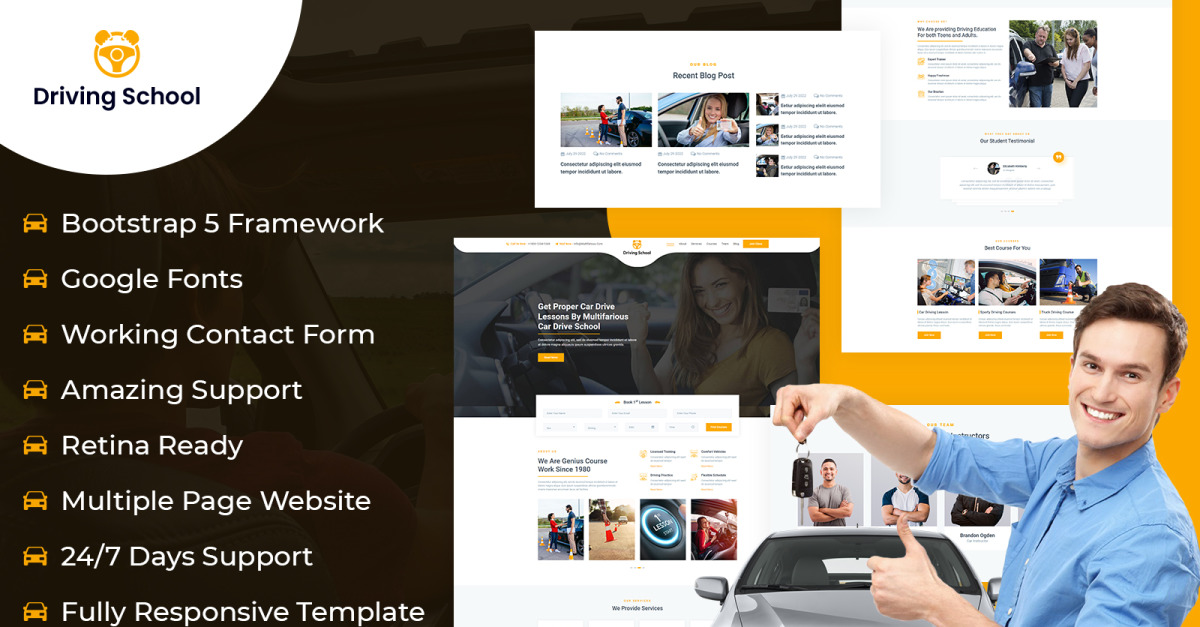 通过驾驶学校 HTML 网站模板吸引更多学习者,让您的驾驶学院达到国际水平的梦想成真。