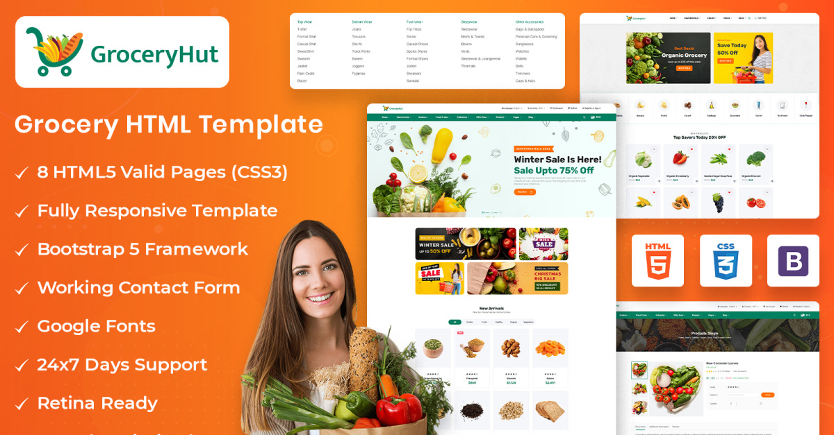 它是一个响应式 Bootstrap 5 HTML 模板,具有 8 个 HTML5 和 CSS3 有效 HTML 页面,适用于各种业务,包括超市、大型商店、大型超市和有机商店。