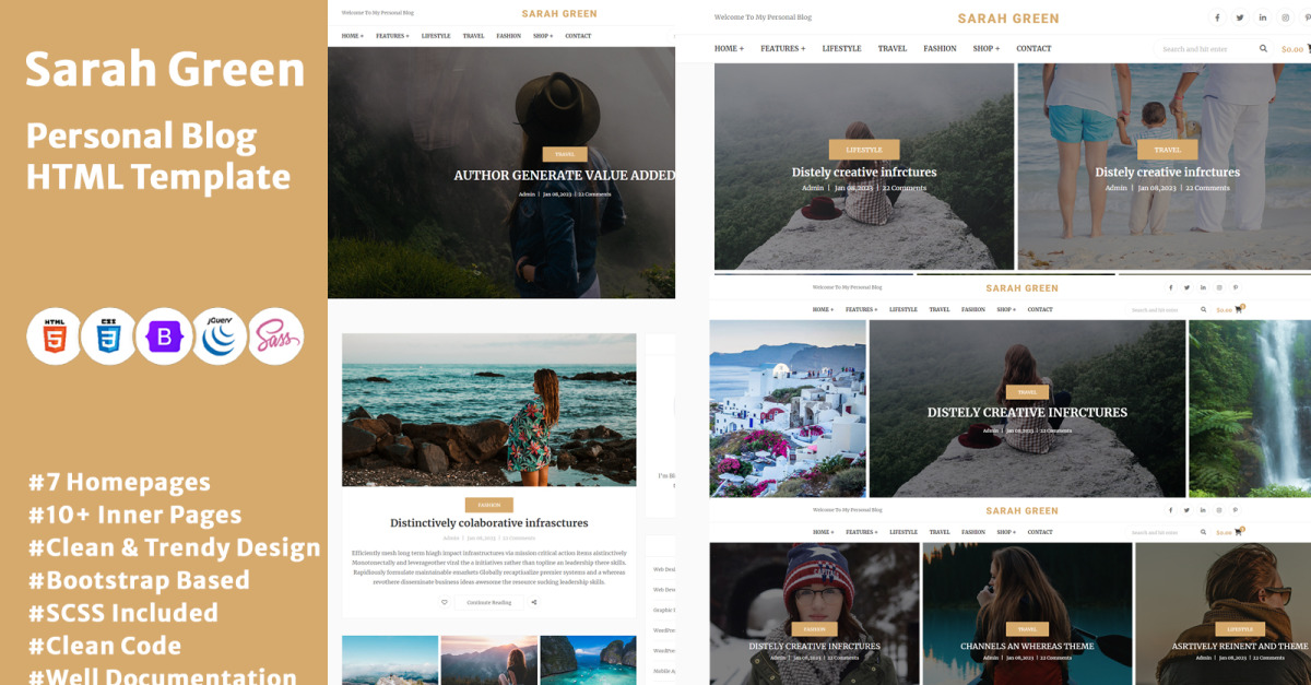 Sarah Green是一个个人博客 HTML 模板,适用于所有个人博客网站。使用此模板,专业人士可以启动一个独特的网站来分享想法和经验。对于联属营销网站来说,Sarah Green 是一个完美的模板,它使用了最新版本的 Bootstrap 。该模板完全响应式、SEO 优化、性能优化、浏览器兼容且加载速度快。它有7 个主页变体和 10 多个内页,很容易转换为WordPress、Joomla、Magento、Laravel 和其他技术。此外,我们有专门的支持团队,随时为售前和售后提供支持。