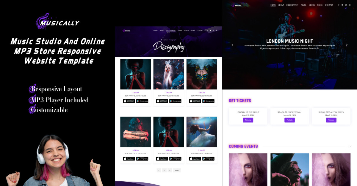 Musically - 音乐工作室和在线 MP3 商店响应式网站模板。这是一个在线音乐 mp3 工作室。这是 mp3 播放器,您可以在其中收听您喜欢的歌曲并添加喜欢的歌曲。它有一个非常流畅的滑块。此外,还有机会观看视频,有机会购买门票。购买前请务必查看现场演示。别忘了留下评论。您的评论激励我做更多漂亮的工作。谢谢。