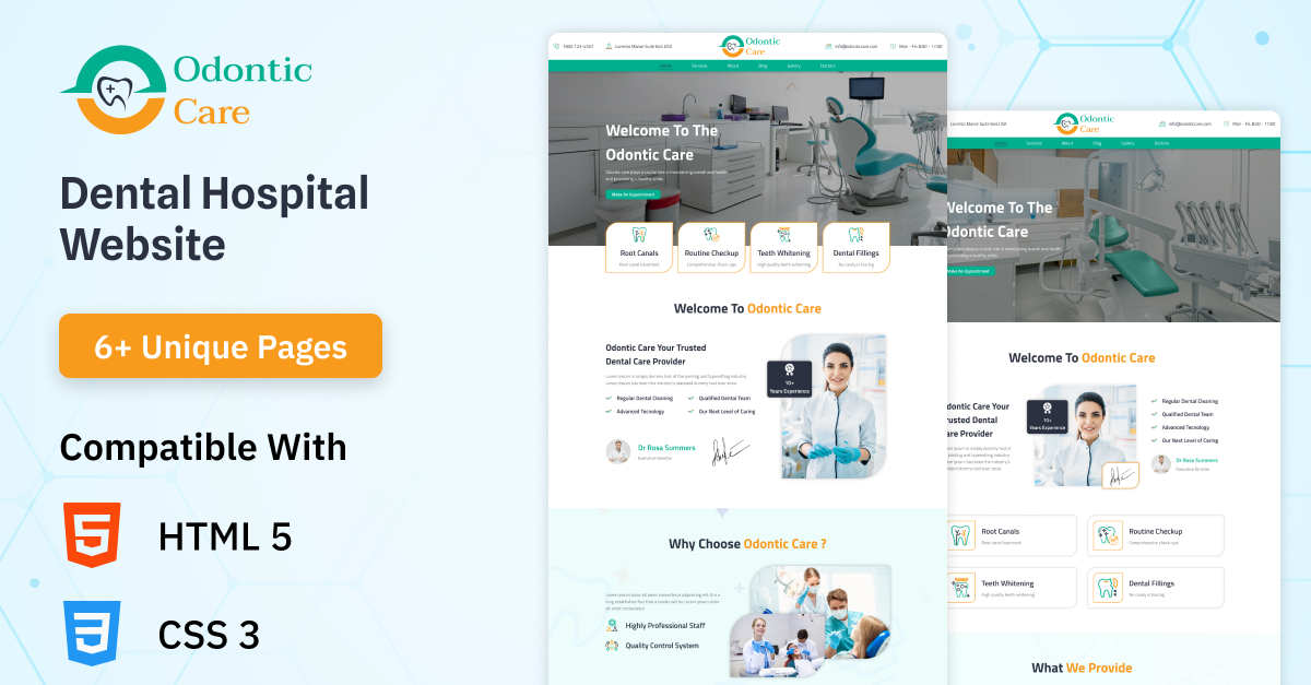 Odontic Care 模板配备了专门针对牙科诊所和医疗保健专家的有目的的组件,包含主页内的指定区域,用于展示员工简介、客户评论和重点服务,同时提示鼓励网站访问者安排预约或寻求建议。