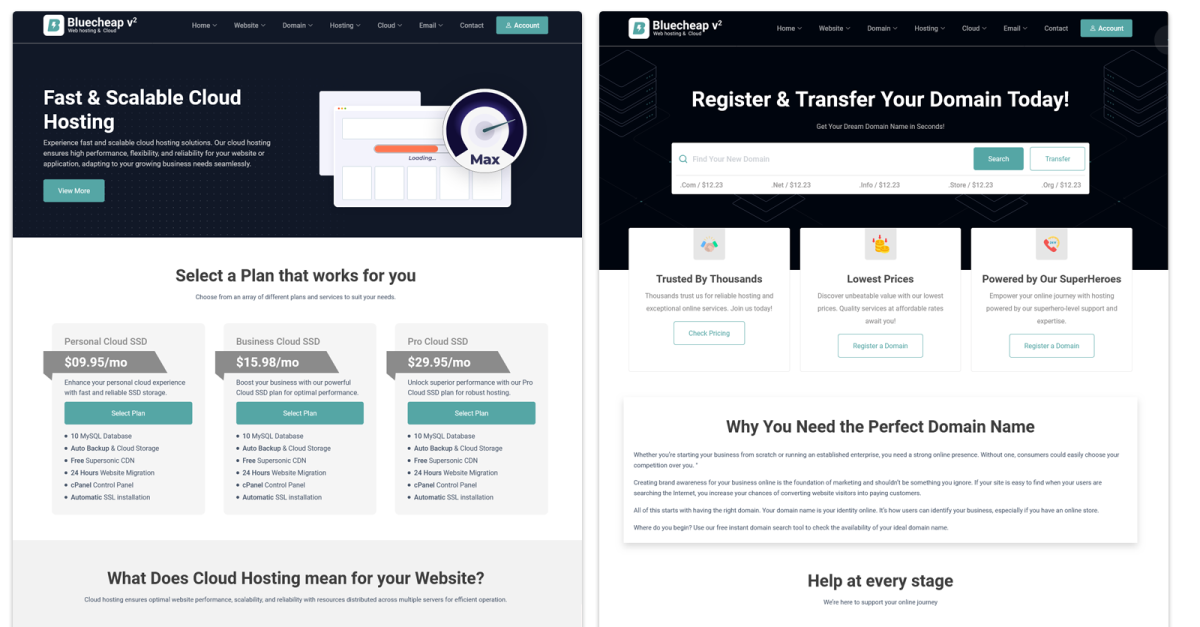 - 时尚现代的设计: BluCheap Host v2 拥有时尚现代的设计美感,具有简洁的布局、直观的导航和吸引访客并传达专业精神的视觉吸引力元素。