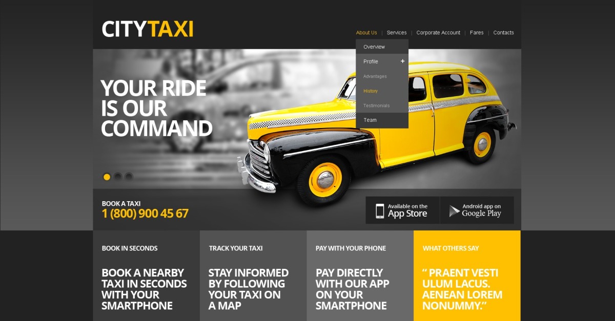通过采用现代出租车网站网页设计制作的网站,激发互联网访问者成为您的客户。该模板 100% 可定制,可以成为出租车公司或出租车服务网站值得信赖的依据。此外,购买此布局您可以获得 24/7 技术支持和丰富的指导。毫无疑问,该网页模板将使您的在线资源发挥最大能力。