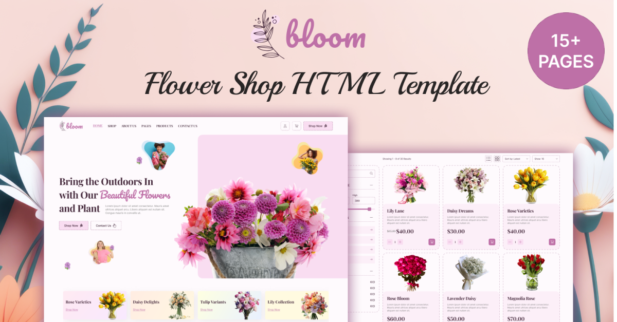 Bloom - 适用于鲜花店和植物、花束和花店的 HTML 模板,是一款精心制作的花卉模板,旨在提升鲜花店、植物苗圃和花店业务的在线形象。凭借其令人惊叹的设计元素和用户友好的功能,Bloom 使企业能够以引人入胜的方式展示其精美的花束、植物和花艺布置。无论您是希望扩大在线形象的花店,还是旨在吸引更广泛受众的植物苗圃,Bloom 都是展示您的产品和服务的完美平台。