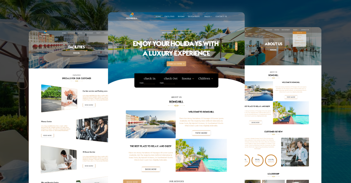 Ronghill - 一个度假村和酒店网站模板。它将非常适合您的度假村和酒店业务,并使您的业务顺利运行。此模板非常适合酒店和度假村服务和预订。此模板共包含 9 页。该模板采用独特的设计组合制作而成。这是一个现代的网页模板,可满足您的业务需求。