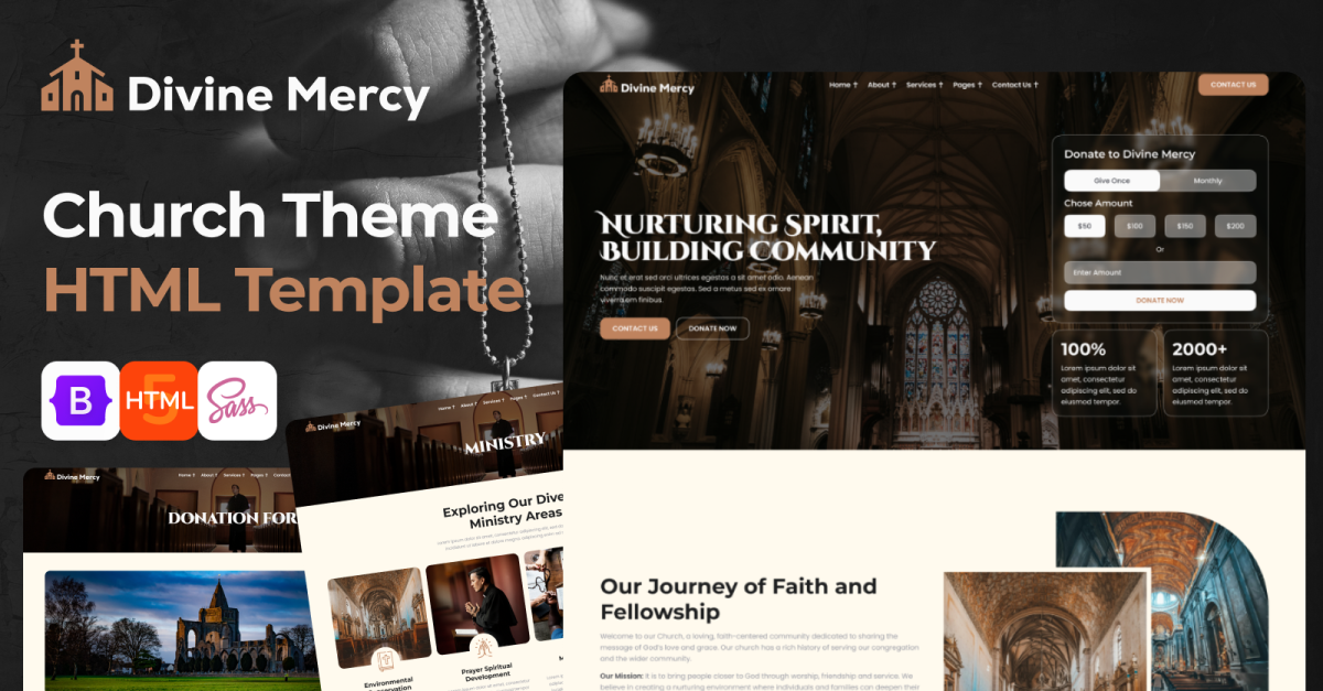 带有活动、捐赠和布道的 Divine Mercy - 教堂 HTML 模板旨在充当您教会社区的数字核心。它不仅仅是一个模板,而是一个全面的工具,供信仰组织以有意义的方式发展、交流和与会众互动。通过提供活动管理、布道流媒体、捐赠选项等全套功能,它使教会能够将其精神使命与现代技术无缝整合。凭借其响应式设计、搜索引擎友好的架构和易于管理的内容部分,该模板不仅可以增强您的在线形象,还可以让您的会众更轻松地保持联系和参与。Divine Mercy 模板提供了您的教会所需的一切,以维护一个现代化、用户友好且引人入胜的网站,该网站反映了您的价值观并有效地服务于您的社区。