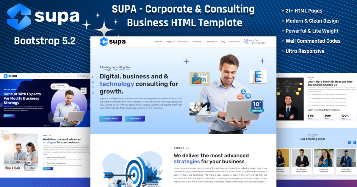 SUPA 是一款全新、出色、简洁、多功能、全响应式的专业 HTML5 网站模板,专为企业和咨询业务而设计。它采用 Bootstrap 技术构建,提供现代且响应迅速的设计,可确保您的企业网站在所有设备上都看起来很棒。它非常适合建立强大的在线形象。它为展示您的服务提供了坚实的基础,旨在吸引潜在客户,同时提供直观和专业的用户体验。