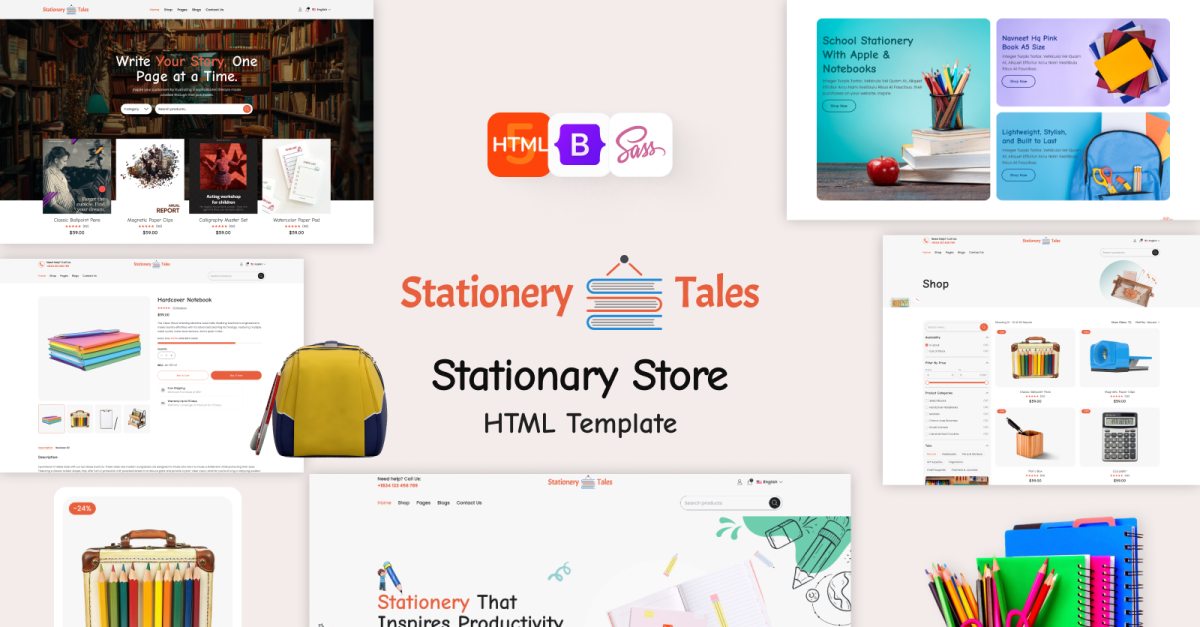 Stationery Tales 拥有强大的电子商务功能,可确保顺畅且引人入胜的购物体验。学校文具 HTML 模板包括主页、关于我们、特色产品、推荐、联系、博客、特色类别、收藏、查看购物车和愿望清单等基本页面,所有这些页面都旨在促进客户互动并推动销售。