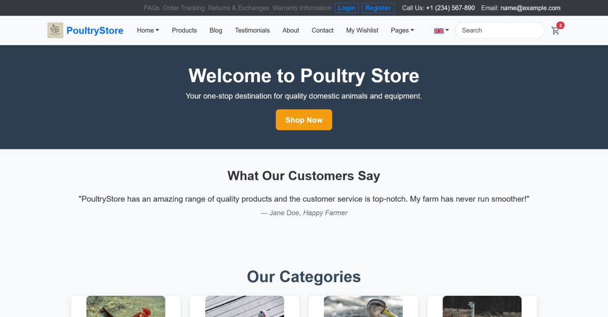 PoultryStore 旨在提升客户体验并最大程度地促进业务增长,使高效销售家禽和农业用品变得前所未有的简单。无论您经营的是小型农场还是大型分销网络,此模板都能为您提供在竞争激烈的家禽行业取得成功所需的工具。