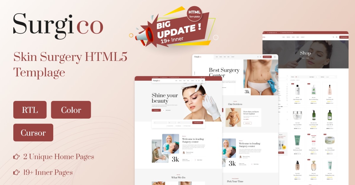 Surgico是一款现代、简洁且完全响应式的 HTML 模板,专为整形外科、皮肤护理诊所、美容水疗中心、医美机构和医疗保健电商项目而设计。无论您是要推出诊所网站、在线商店还是医疗保健落地页,Surgico 都提供所有必要的功能,助您打造专业且极具视觉吸引力的在线形象。
