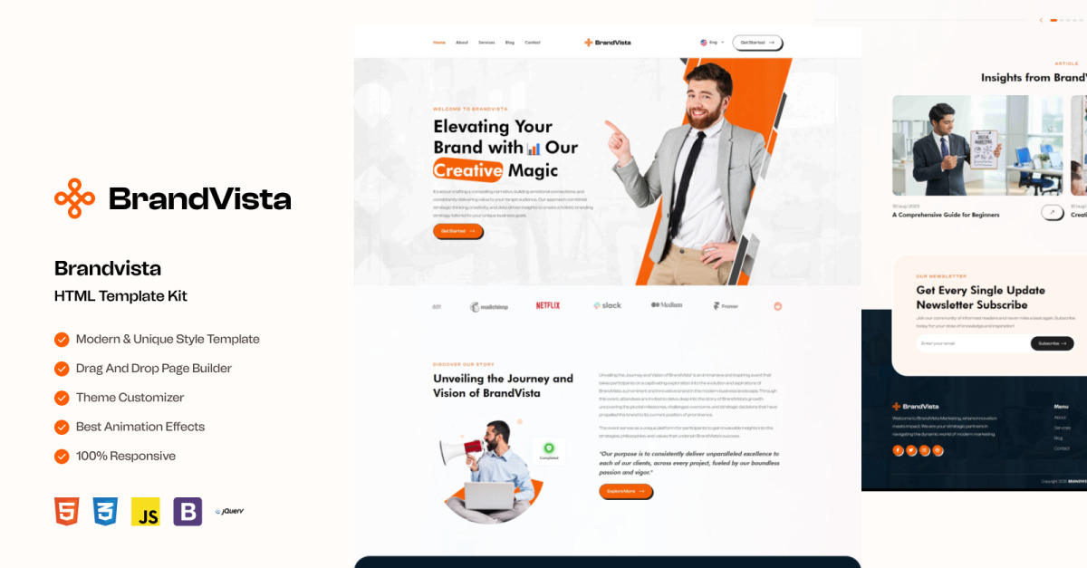 Brandvista 是一款时尚、现代且响应迅速的多页 HTML 模板,专为创意机构、品牌工作室、营销公司、初创公司和商业服务提供商设计。Brandvista 采用 HTML5、CSS3 和 Bootstrap 构建,布局简洁,包含服务、作品集、用户评价、团队成员、博客和联系表单等板块。其直观的结构和灵活的设计使其易于根据各种业务领域进行定制。无论您是要创建公司网站、个人作品集还是数字代理平台,Brandvista 都能确保您拥有专业且引人入胜的在线形象。该模板支持 SEO,针对移动设备进行了优化,并可在所有现代浏览器和设备上正常运行。