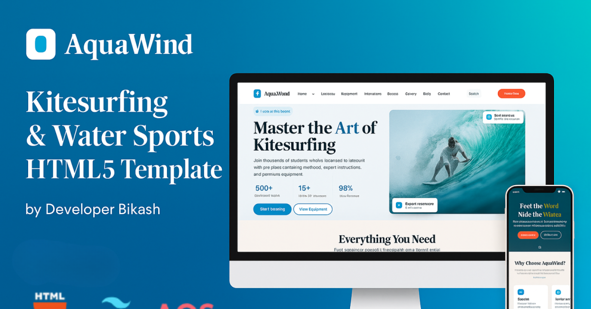 AquaWind是一款现代化、响应式的 HTML5 模板,专为风筝冲浪学校、水上运动教练和设备租赁企业打造。AquaWind 拥有简洁的海洋风格设计、移动优先的布局以及实用优先的 Tailwind 类,可提供快速、灵活的用户体验。