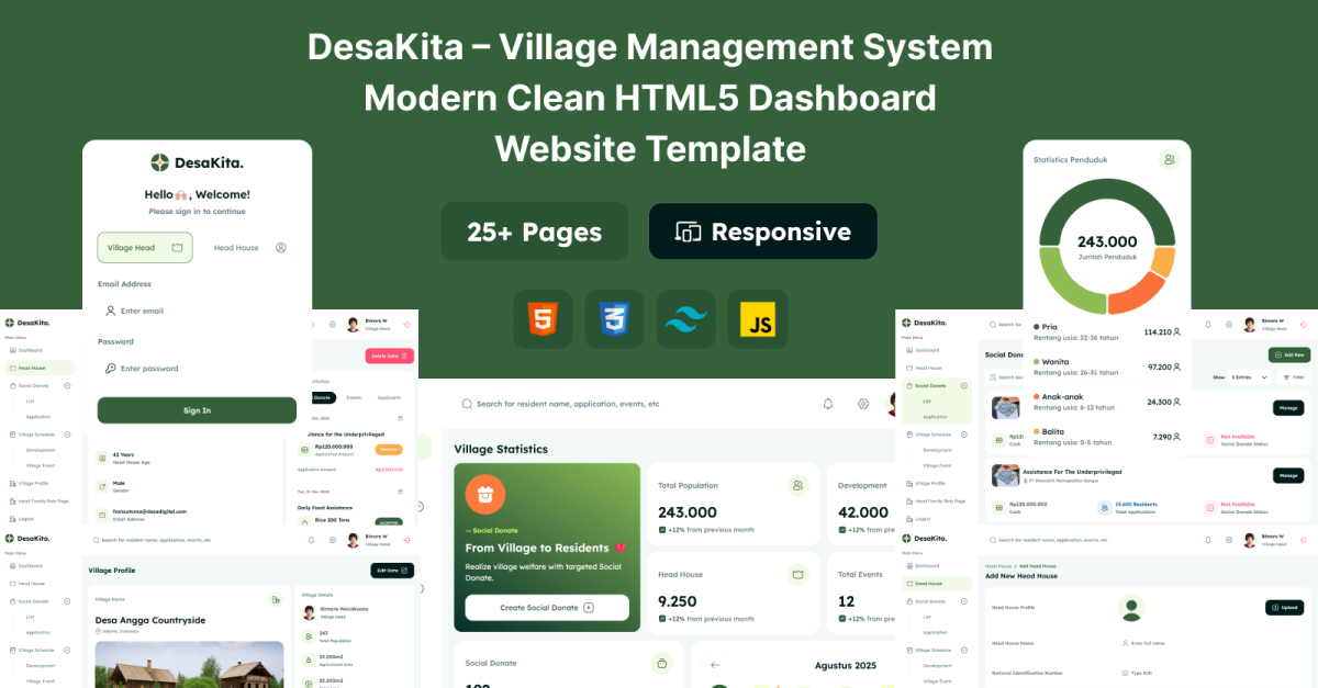 DesaKita 是一个全面的村庄管理系统 HTML5 模板,专为地方政府行政、社区管理和乡村发展项目而设计。这款现代化、响应式的模板为村长、地方政府官员和社区管理员提供了一套完整的解决方案,帮助他们高效地管理村庄运营。