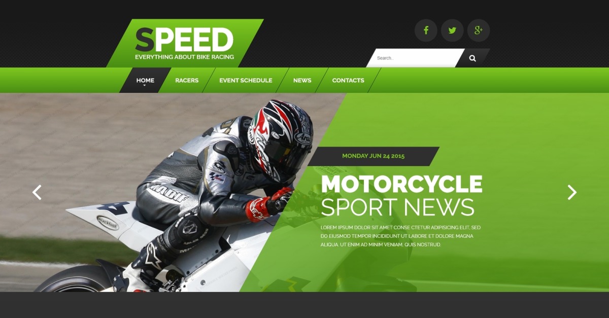 如果您渴望超越网站设计的平庸,那么这个引人入胜的赛车网页模板是正确的选择。由于不常见的几何形状(例如平行四边形菜单项和梯形按钮),您可以为其添加非凡的触感。该主题拥有深色背景,并配有插图和绿色 UI 元素。只有社交媒体部分以浅色调制作,以立即吸引访客的注意力。该模板响应灵敏且跨浏览器兼容,无论人们决定在哪里查看它,它都会看起来完美无缺。适合移动设备的菜单增加了这个机会。
