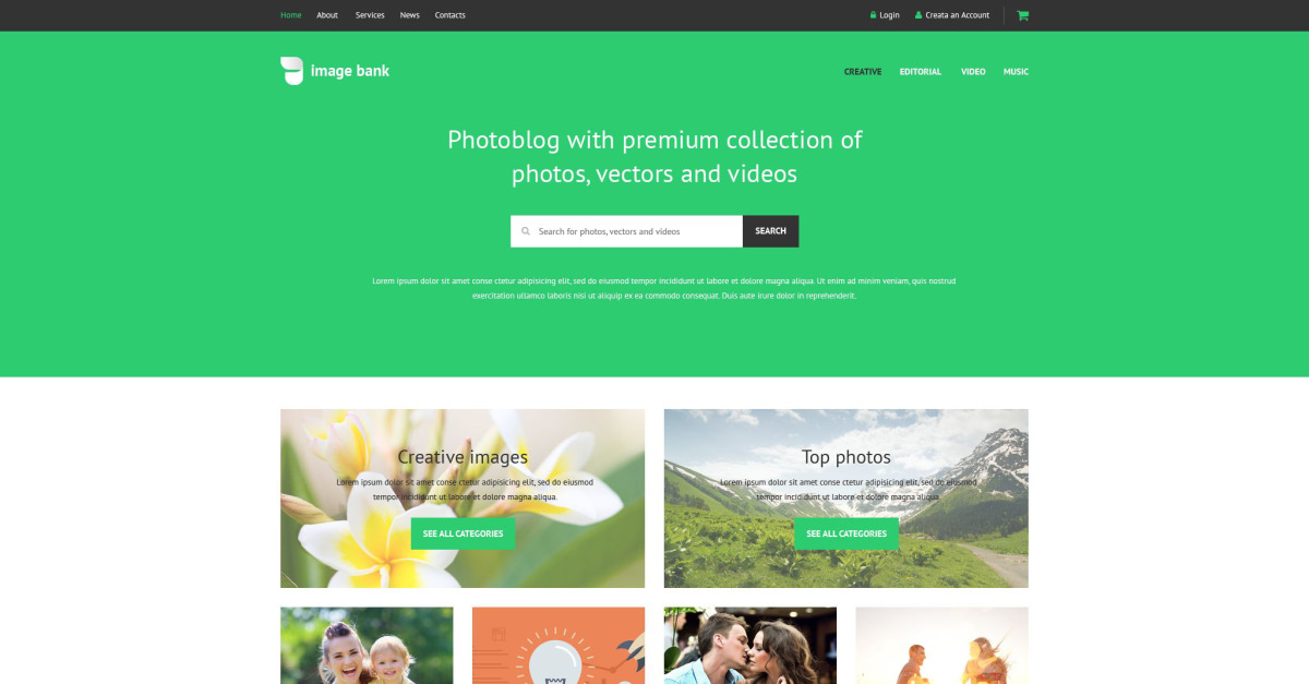 如果您正在寻找在线销售照片的解决方案,请考虑 Image Bank 。这是完全敏感库存照片 在平的样式设计的网站模板将在各种各样的设备上看起来美妙。实时搜索栏成为人们关注的焦点。借助它的帮助,用户只需点击几下即可找到所需的照片、矢量和视频。清晰的分类和简单的菜单也应该有助于搜索。通过下载主题,您将可以使用多种方便的功能,例如移动菜单、SuperFish 下拉菜单、切片 PSD、Google 网络字体等等。