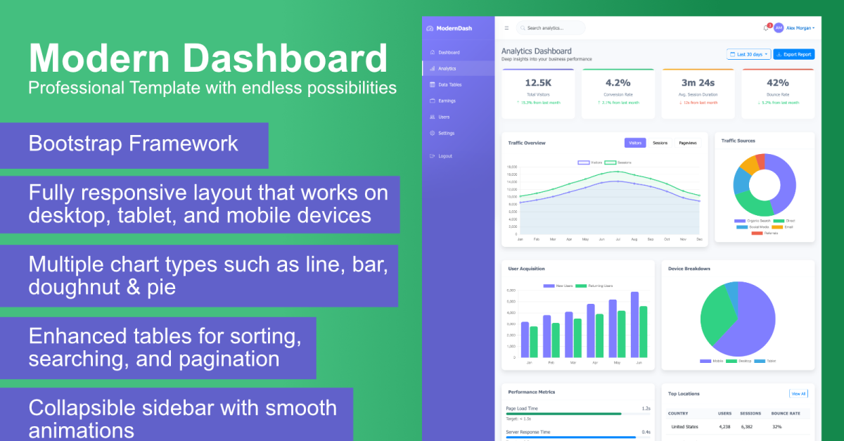 这是一个基于 Bootstrap 5 构建的响应式后台管理面板模板。它包含 6 个页面(仪表盘、分析、数据表、收益、用户、设置),配备交互式 Chart.js 可视化图表、支持搜索/排序/分页的数据表以及可折叠侧边栏。模板采用渐变效果、流畅的动画和移动优先的布局。它使用 Bootstrap 5.3、Chart.js 4.4、DataTables 1.13、Bootstrap 图标和 AOS。无需构建,即可直接在浏览器中使用。适用于后台管理面板、分析仪表盘和数据管理应用程序。