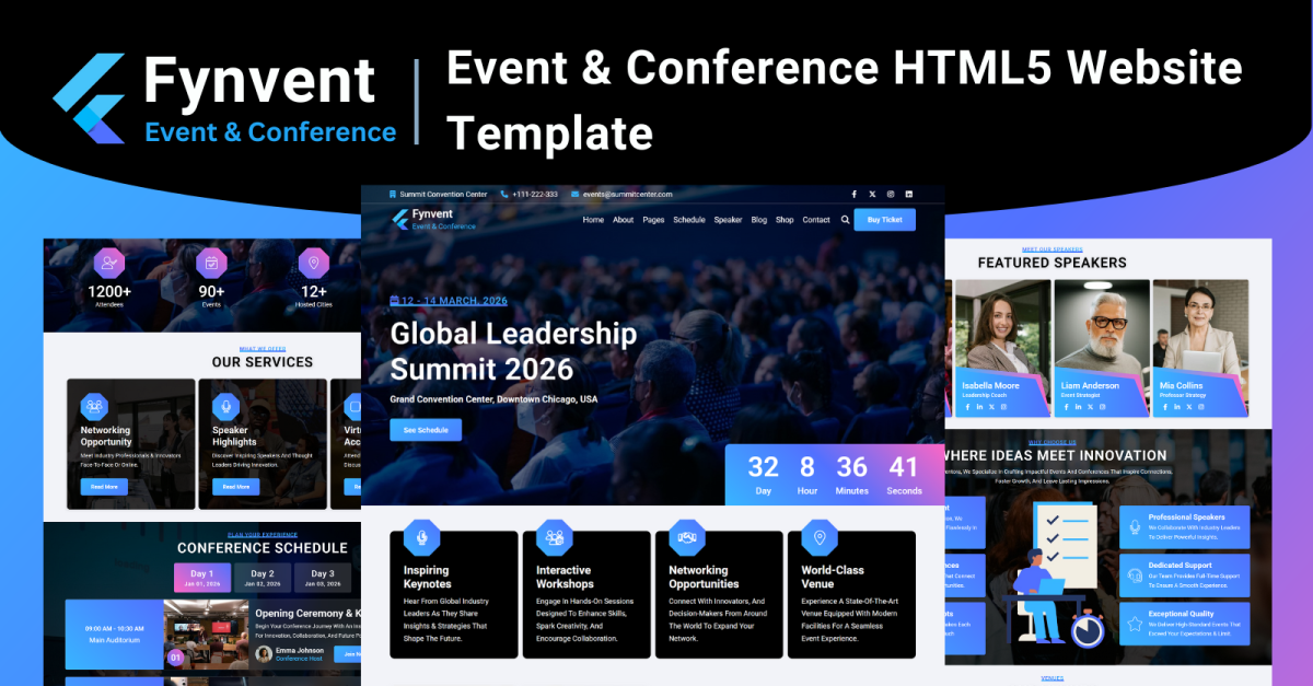 Fynvent 是一款现代且充满活力的HTML5 网站模板,专为活动组织者、会议策划者和专业聚会主办方而设计。该模板采用最新的HTML5、CSS3和JavaScript技术构建,提供简洁流畅、互动性强且性能卓越的平台,助您自信地推广即将举办的活动。无论您是管理商务会议、贸易展览、颁奖典礼还是学术峰会,Fynvent 都能提供您所需的一切工具,让您的活动脱颖而出。