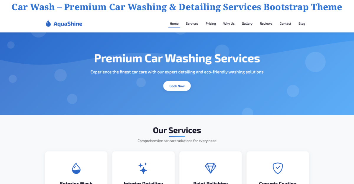 AquaShine 是一款现代、简洁且完全响应式的洗车及汽车美容 HTML5 模板,采用Bootstrap 5构建,拥有流畅的动画效果和优质的 UI 设计。专为洗车中心、汽车维修车间、汽车美容工作室、陶瓷涂层服务商和汽车清洁企业量身打造,这款模板可提供完整的专业网站体验。