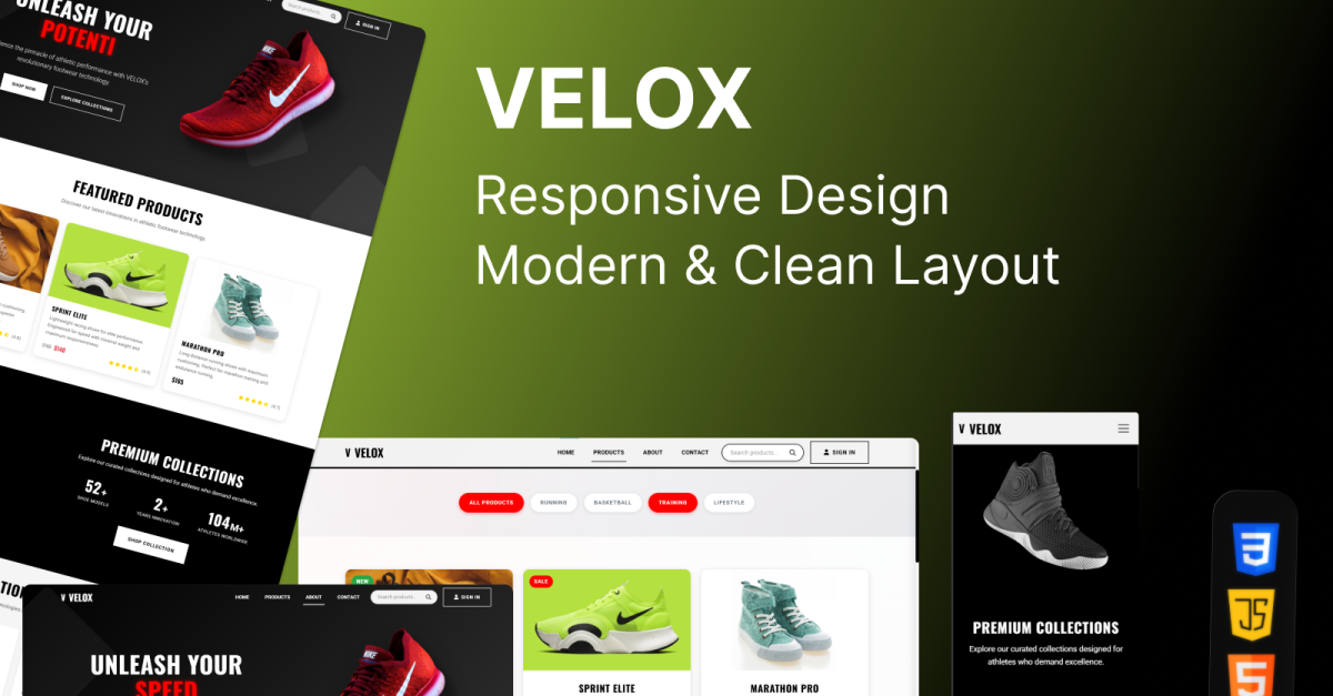 Velox 具有完全响应式设计,并完美适配移动设备。无论是跑鞋还是休闲运动鞋,每一款鞋型都能在各种设备上呈现完美效果。其灵活的设计提升了用户在台式机、平板电脑和智能手机上的使用体验。这使其成为客户演示、原型展示或静态在线产品目录的理想之选。