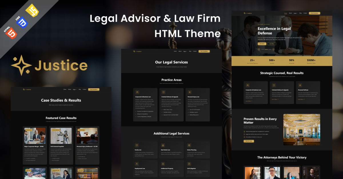 Justica 是一款现代、优雅且完全响应式的 HTML 模板,专为律师事务所、法律顾问、律师、辩护人和咨询公司量身打造。它采用专业的布局和简洁的代码,提供法律网站所需的所有基本版块——从律师简介和业务领域到案例研究、常见问题解答、客户评价和联系表单。
