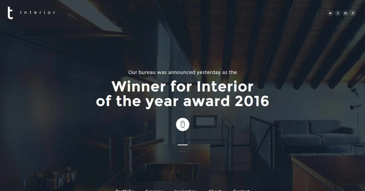 对于室内和家具公司来说,这是一个非常有趣的设计。主题的主菜单在页面上的位置降低了。如果目前这种导航对您来说更方便,您可以使用它移至下一页或向下滚动。数字和大标题在室内网页模板的柔和简约布局中脱颖而出。最后一页显示了 Instagram 上最受欢迎的公司项目。谷歌地图位于页面底部。联系人和社交媒体块位于网页的右下角。