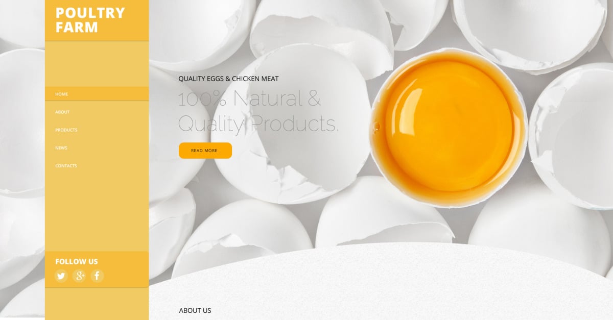 这个完全响应式的网站模板采用赏心悦目的黄色设计,最适合农业业务。家禽农场网站模板具有易于浏览的布局结构。主菜单移至左侧边栏。 Twitter、Google 和 Facebook 社交分享选项位于其正下方。圆角和椭圆形元素为主题增添了更精致的外观。关于我们的故事、您销售的产品和最新的博客更新都显示在主页上。联系方式和简单的联系表格位于主题的页脚中。如果您需要更改此家禽农场网站模板的外观和风格,您可以通过方便的自定义工具轻松完成。