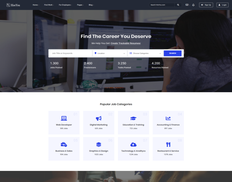 Hireyou 是一个干净、现代的求职板 HTML5 模板。 Hireyou 最适合工作委员会和自由职业者、代理公司、列表、房地产、酒店、咖啡馆、餐厅。这是一个业务模板,有助于企业业务和求职公司的在线展示。