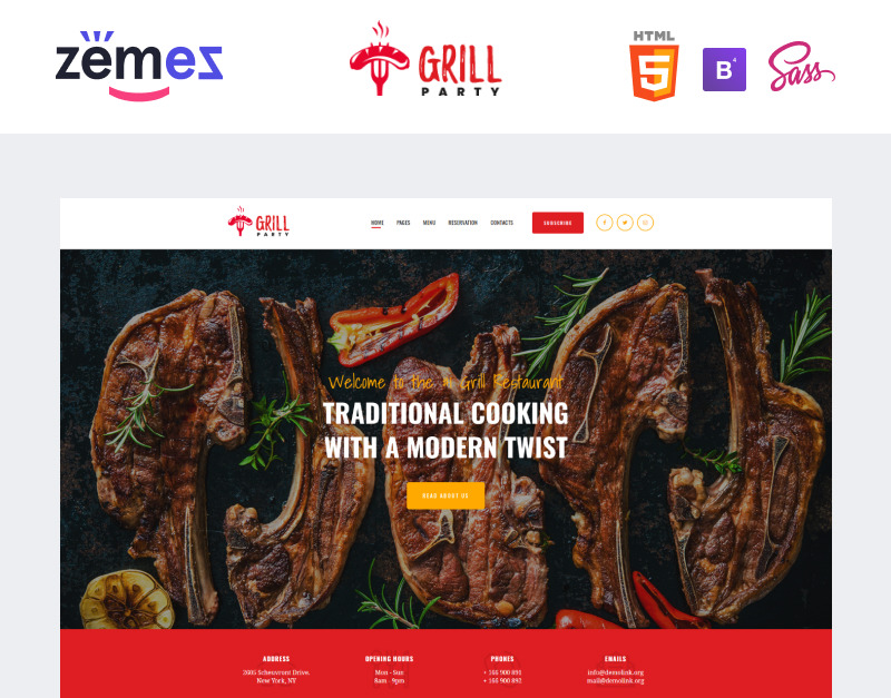 例如,GrillParty烧烤餐厅网站模板就是专门针对上述目的而开发的解决方案。它具有引人注目的设计来吸引客户。然而,它也足够干净,可以突出显示最重要的信息。此外,此 HTML 模板为您的网站提供了广泛的有用功能: