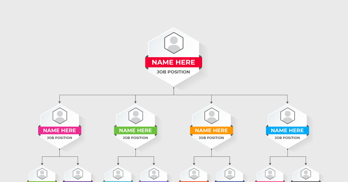 数据分析信息图表模板。职位分类图表设计与彩色六边形形状。用于办公室管理的数据分析和演示模板向量。业务位置可视化信息图表矢量。