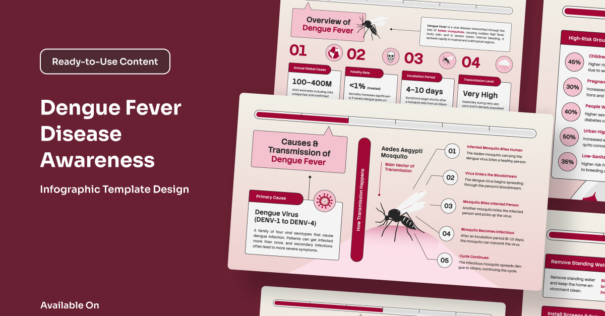 这款医学信息图模板旨在将复杂的疾病信息简化为结构清晰、简洁易懂的视觉呈现。它采用舒缓健康的色调、现代的字体和清晰的图标,确保读者能够快速、自信地识别症状、传播途径和预防措施。