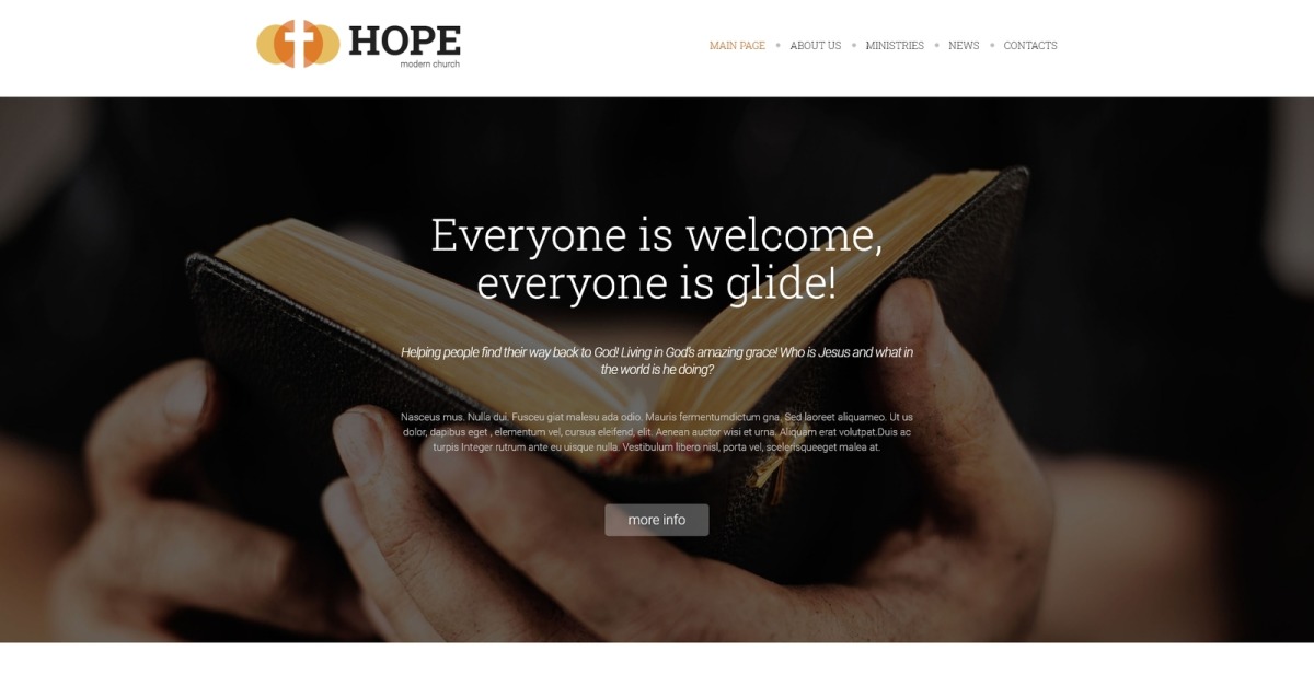 我们所有人在一生中都会面临困难时期。当所有其他方法都已尝试过但没有任何帮助时,我们转向上帝。无论您属于哪一类教区居民,只要同意,由于在线存在,教会将变得对新人更加亲近和开放,并且对忠实的信徒更加方便。我们的模板相当通用,因此它适合不同的宗教。在这里,用户可以找到有关教堂的所有必要信息,甚至是它在谷歌地图上的位置。如果您的教会想要向更多的人传达上帝的话语,这个网站可以成为实现这一崇高目标的绝佳机会。
