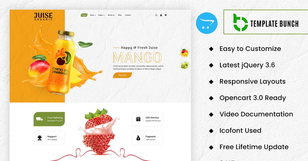 Juice Organic – 一款多功能且复杂的 OpenCart 响应式主题,专为营销一系列特殊果汁和水果而设计。此多用途模板可用作专业演示,提供响应式布局,确保在移动设备和 iPad 上获得最佳观看效果。此外,全面的视频文档将指导您完成在线展示商店的过程。定制毫不费力,可以轻松修改图像和产品。该模板采用最新的 jQuery,内置 OpenCart 3.0.3.9 版本,保证与所有 OpenCart 3.0 设备兼容。此演示中使用 icoFont 和 Font 等 Google 字体作为图标。此外,还提供连续的 24*7 支持以及独特的滑块和横幅部分,增强了其独特的吸引力。