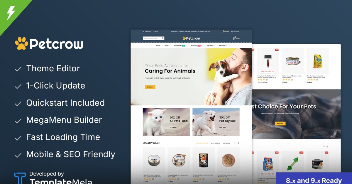使用快速入门安装包,您可以在几分钟内启动您的网店,轻松导入所有演示内容和设置。Petcrow 包含多种基于 AJAX 的功能,例如实时产品搜索、按类别筛选、购物车和愿望清单更新以及快速查看选项,确保为顾客提供流畅、快捷且互动性强的购物体验。