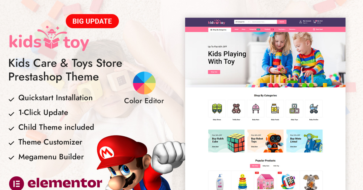 无论您是销售玩具、拼图、学习游戏还是婴儿礼品, KidsToy都是构建生动、用户友好且高性能的在线商店的理想 PrestaShop 主题,能够让顾客满意并提高销售额。
