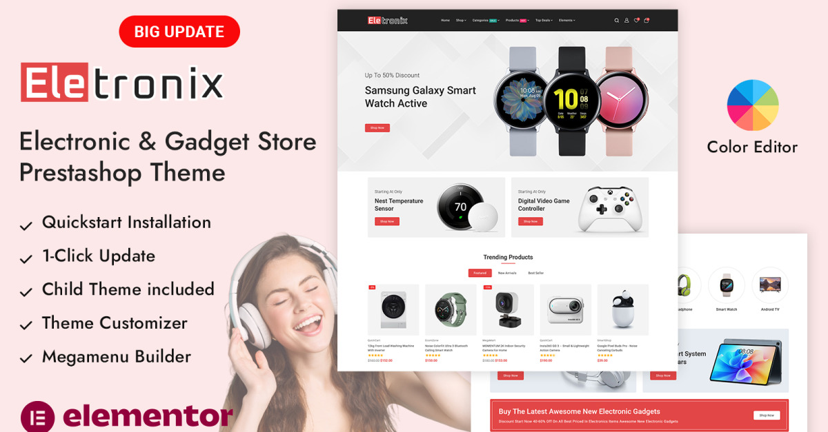 Eletronix – 在线电子科技商店 PrestaShop 响应式主题是一款现代化的高性能电商主题,专为电子产品零售商、数码产品商店和以科技为核心的在线企业打造。Eletronix 采用简洁专业的界面设计,让您能够以清晰、有序且极具视觉吸引力的方式轻松展示复杂的科技产品。无论您销售的是智能手机、笔记本电脑、配件、智能设备还是数码电子产品,这款主题都能为打造值得信赖且以转化率为导向的在线商店奠定坚实的基础。